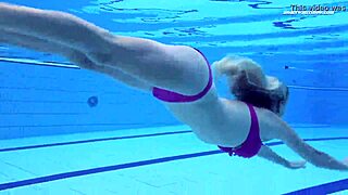 Two hot Russian babes dive naked into swimming pool fun