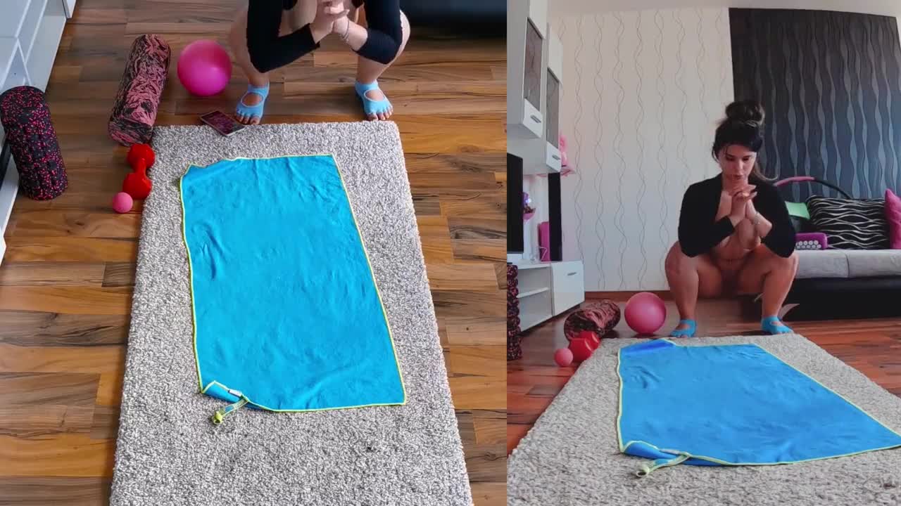 Curvy milf performs naked yoga workout in dual cam