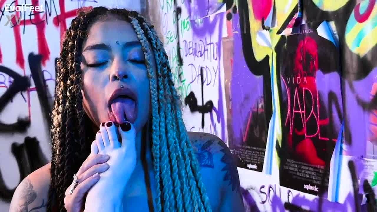Latina makes redhead cum hard licking her feet in lingerie.